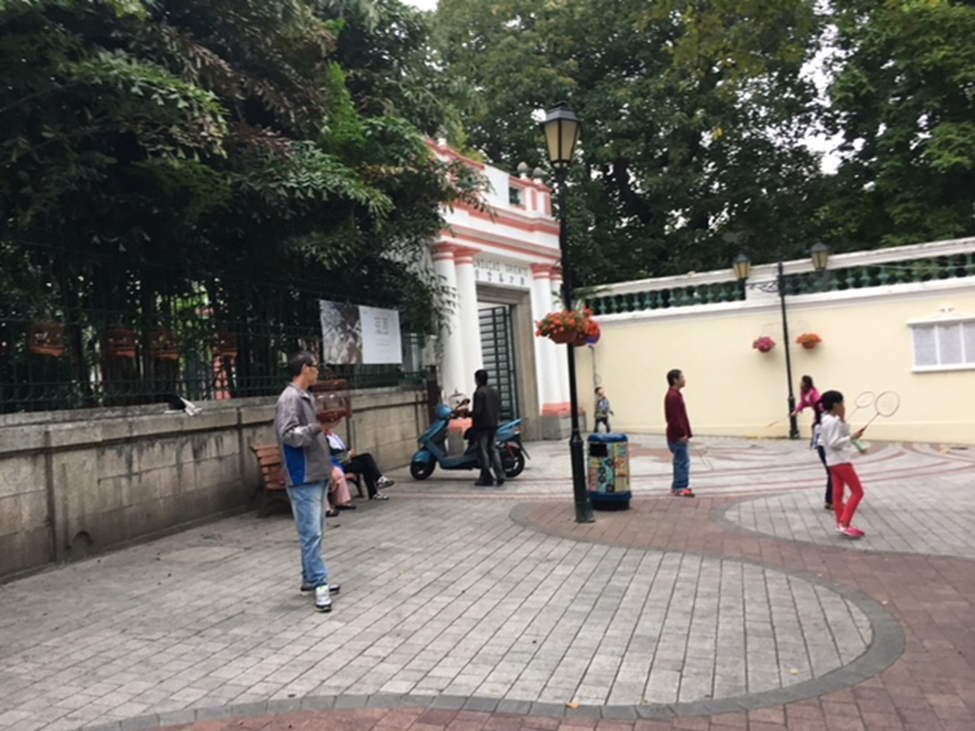 Selepas ziarah ke pemakaman Old Protestant Cemetery, saya kembali ke Praca de Luiz Camoes. Hari kian menjelang senja. Di tempat ini, banyak sekali penduduk Macau yang sedang bersantai. Tua, muda, maupun anak-anak. Para lansia sebagian sedang asyik bermain catur gajah, ada juga yang berolahraga, dan anak-anak bahkan sedang bermain bulutangkis.