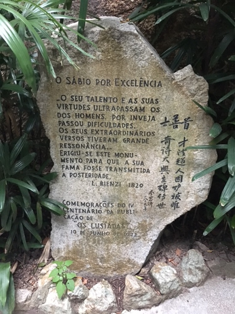 “Comemoracaoes do iv centenario da publicacao de os lusiadas 10 de junho de 1972”, demikian tertera di bagian bawah prasasti yang menyatakan bahwa prasasti ini dibuat pada 10 Juni 1972 dan dibangun untuk memperingati 400 tahun di terbitkannya karya Camoes yang paling terkenal yaitu “Os Luciadas”. Os Lusiadas sendiri sering diterjemahkan sebagai The Soul of Portugal”.