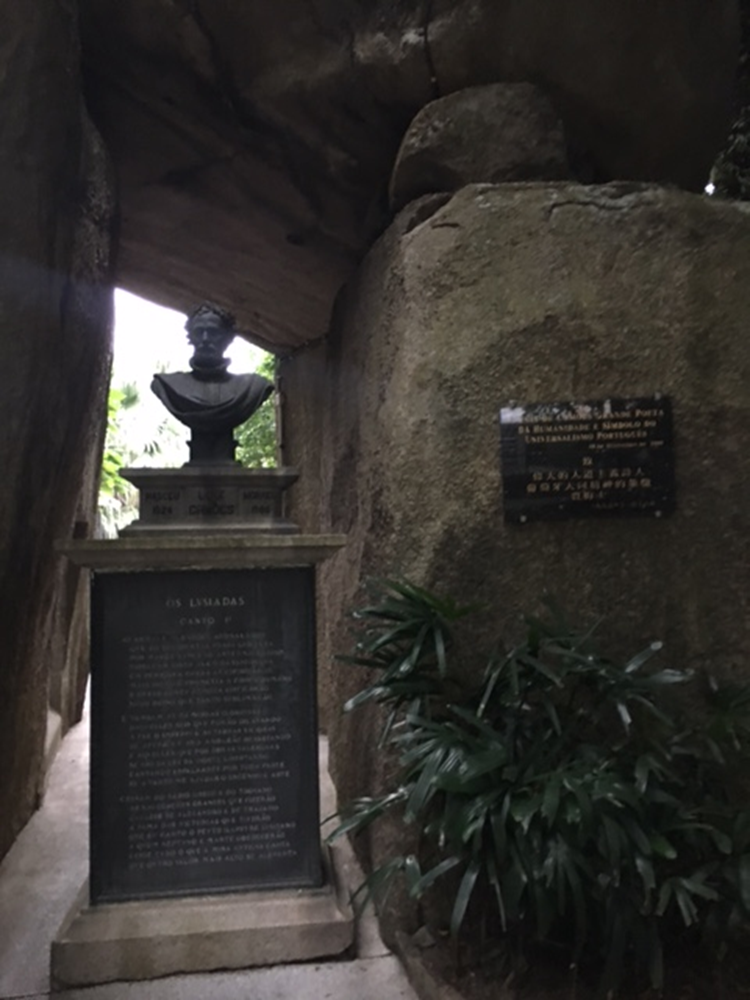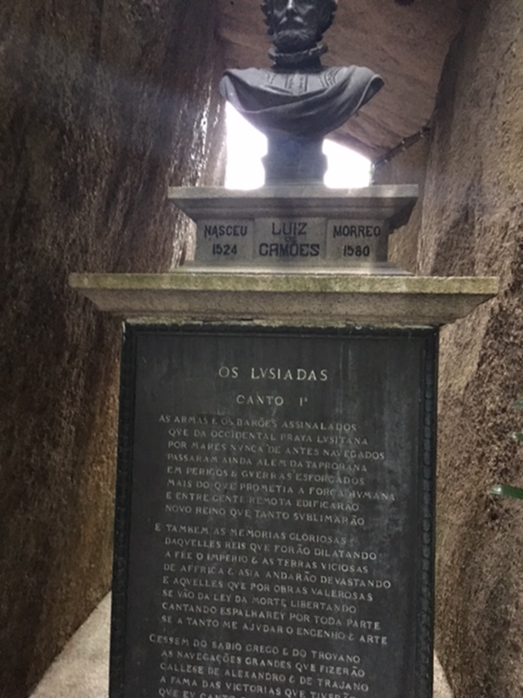 Not far from this inscription, in a grotto dedicated to Luiz Camoes, is a bust of the most famous poet in Portuguese history. Luiz Camoes is the name engraved beneath the bust. This name is flanked by the years of his birth and death, written in Portuguese: “Nasceu 1524 and Morreo 1580.”