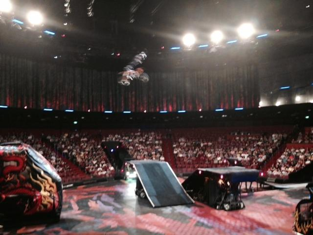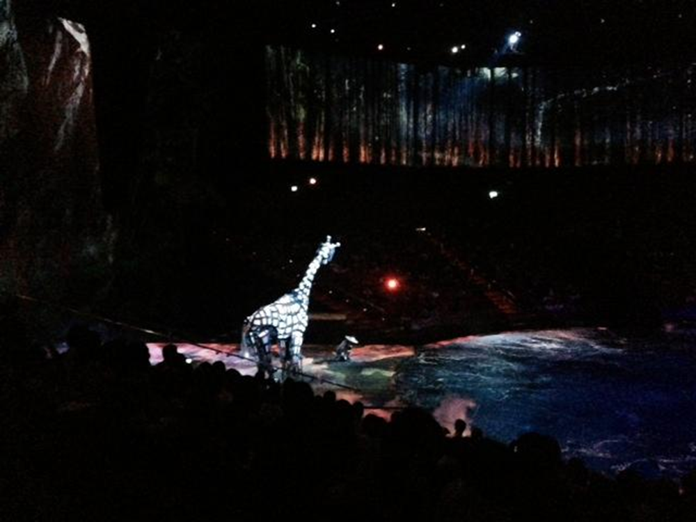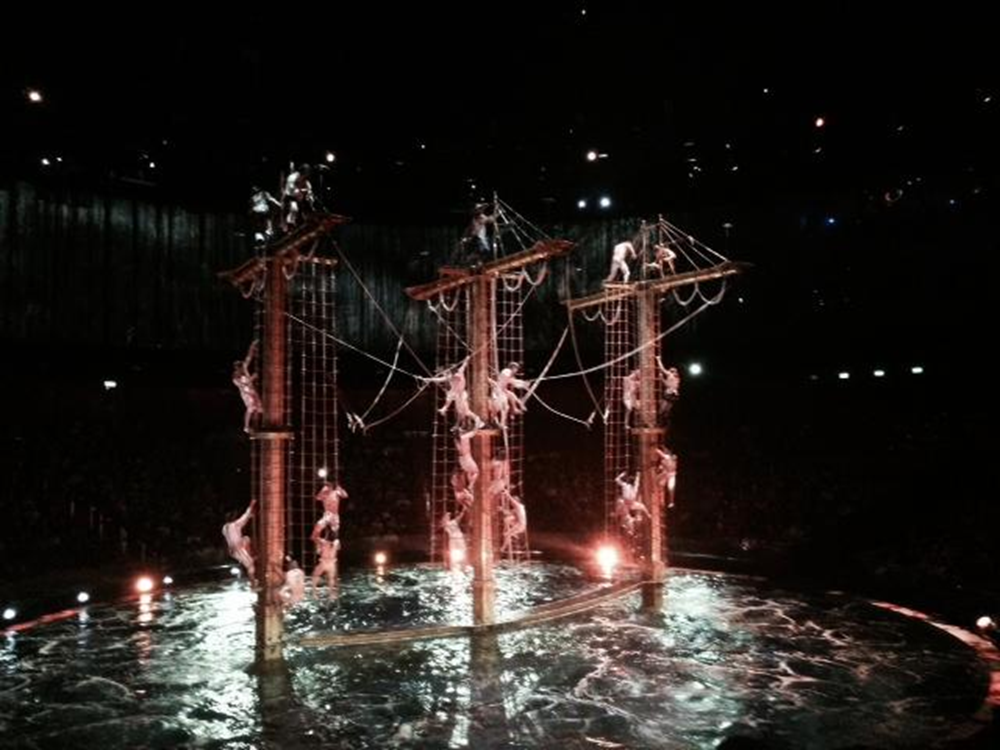The lake-like stage itself reportedly contains over 3 million gallons of water, equivalent to five Olympic-sized swimming pools. And atop this shape-shifting pool, we witness a circus show complete with comedians, motorcycle stunts, acrobatics, dance, ballet, drama, and even freefalls accompanied by graceful water dances. Of course, minus the real animals!