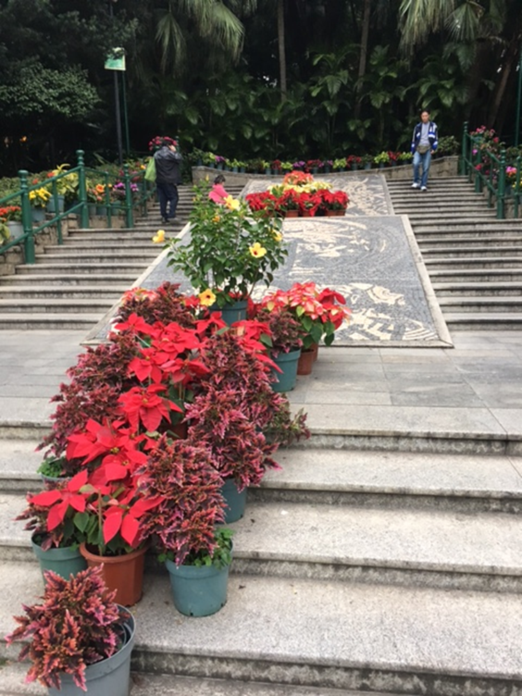 花园中央矗立着一座纪念碑,周围环绕着高大的树木。这座名为“拥抱”的青铜纪念碑或雕像,象征着中国和葡萄牙之间的友谊。一座小喷泉更添其美。红、黄、粉三色的花朵和锥形松树,让卡蒙斯花园的氛围更加宁静祥和。十二月下旬澳门凉爽的空气中,微风拂面,更添一份惬意。